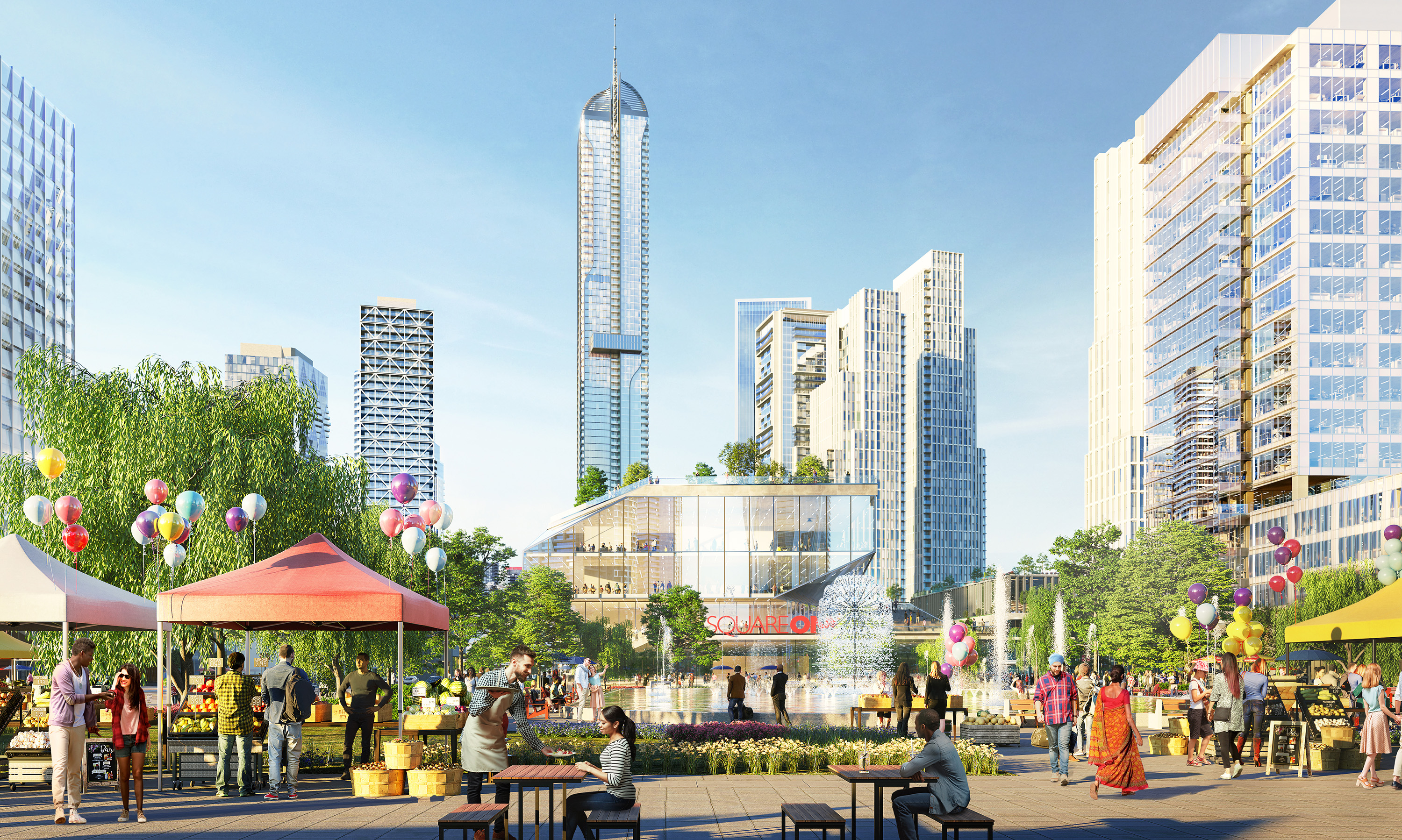 The Square One district is actually the largest downtown master plan community in Canadian history. The executive vice president of Oxford Properties said that their ambition is to create a community that 35,000 people will be proud to call home, all while supporting commerce with state-of-the-art office towers and the new transit options that Mississauga is going to be bringing online. In other words, they're going to give us space that we can live, work, and play in. This walkable community will be accessible from all of the new transit options and the LRT, which is going to have a stop there.